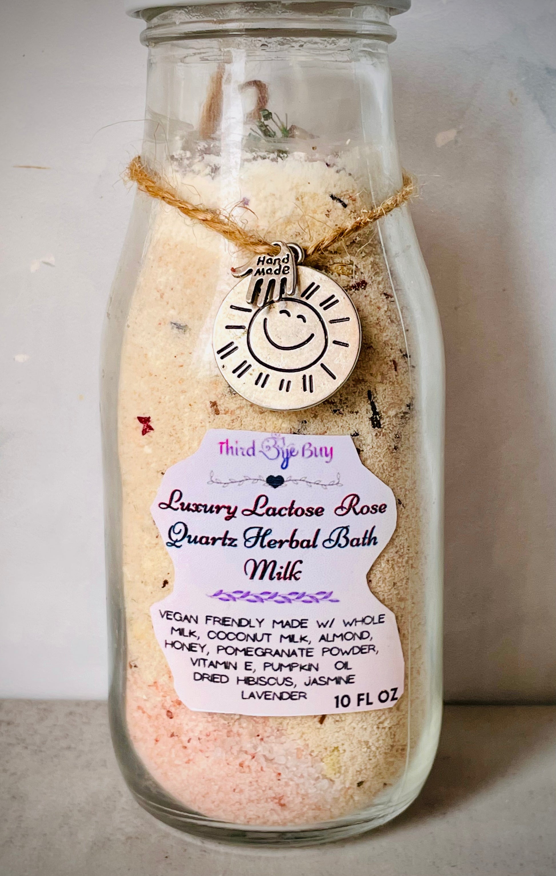 Blended with a variety of powdered milks (whole, coconut, almond milk ) and organic honey, pomegranate, powder and vitamin E, pumpkin oil w/ dried hibiscus and lavender. It also has pink Himalayan, Dead Sea salt and magnesium flakes to help relieve tension and aches and pains. Of course rose quartz is through out these wonderful bathtub essential, to help heal your heart chakra and bring balance , or if it’s unblocked this will simply add positive vibrations and make your aura glow along with your skin!