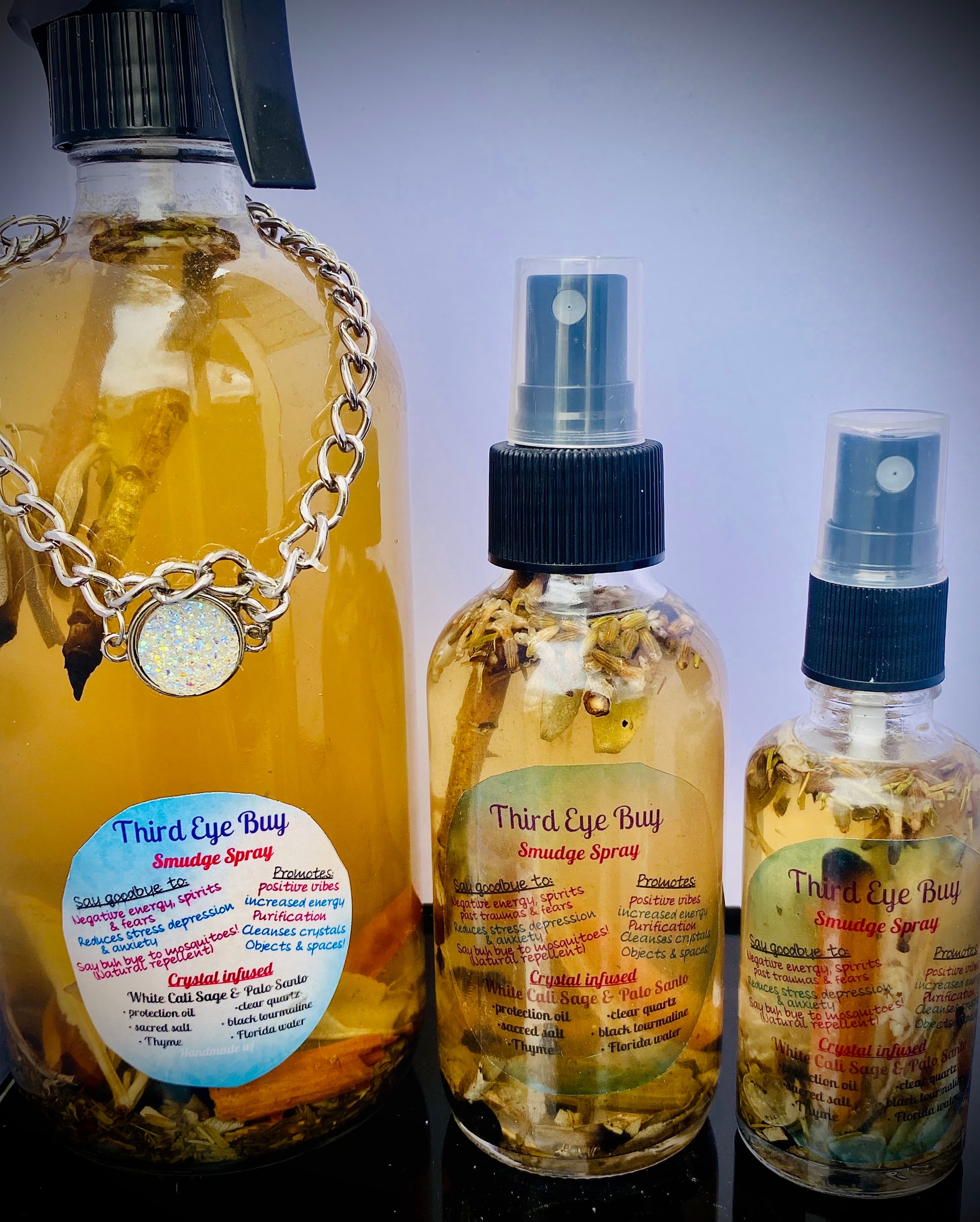 This Smudge Mist is a alternative to burning a sage or palo santo stick - accept on steroids! Made w/ new or full moon purified water, also has a splash of Florida water, a pinch of blessed sea salt, thyme, lavender & cinnamon! All ingredients together make for a powerful mist to help cleanse & protect your energy, clear out lingering negative vibrations & leave your atmosphere purified.